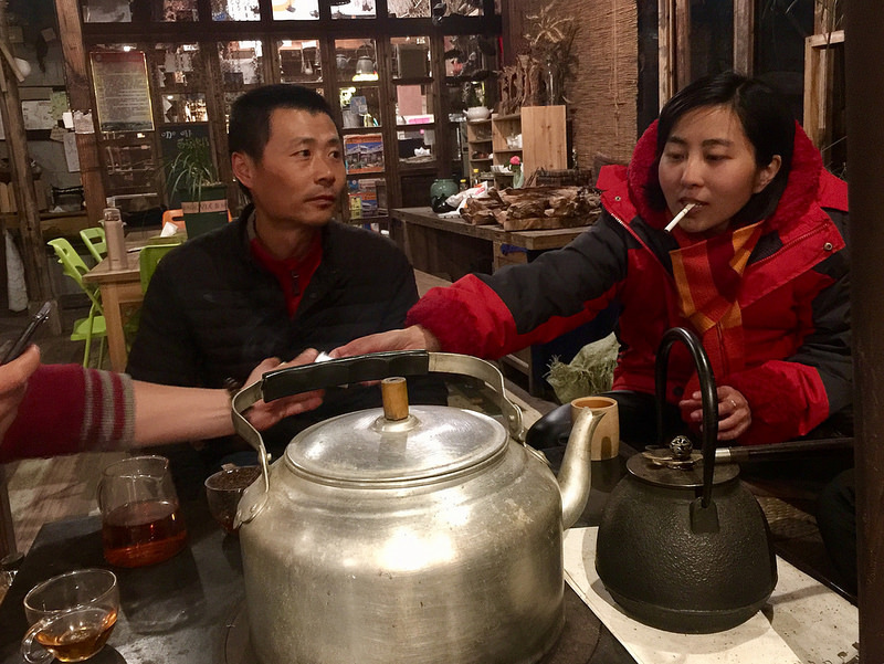 這時入夜後實在冷,大家圍著爐火,我恨不得把腳貼到爐火上(千萬別,會掉皮的)。老闆燒著火、煮著水,拿出紅茶葉與茶壺泡起了茶。只見他動作十分嫻熟,熱水沖下去,紅茶香便在空氣中飄散開來。