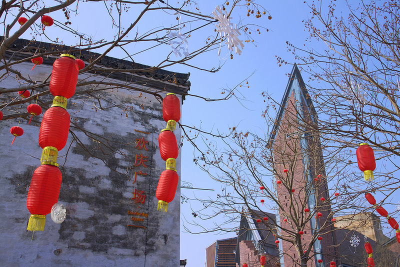 同樣是老街,但這裡比屯溪老街少了那些千篇一律的觀光特產店,氣氛就沒那麼商業化,雖然多了些現代建築,很多是新建或正在建設的餐廳,但路比較寬敞;而古典與現代彼此交錯,互相融合而不衝突,有幾分文創園區的文青感。