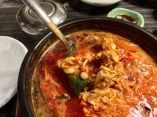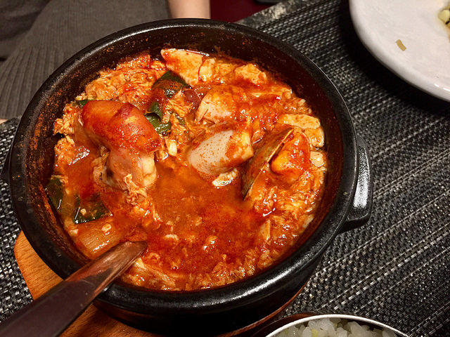 湯鍋類都為一人份,附一碗白飯。鍋子小小的,但裝得很滿。湯頭雖辣,不過因為是海鮮,所以比較清爽。可因為魷魚味道太重,導致我覺得湯頭喝起來都是它的味道。