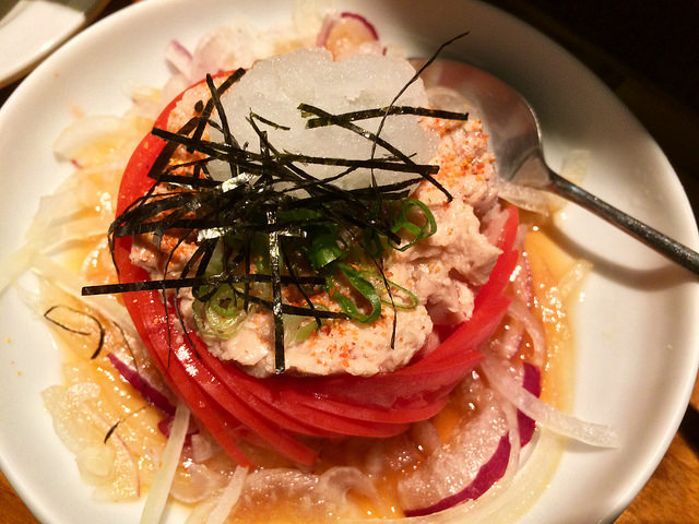 而且配著和風醬、蕃茄與生洋蔥一塊吃,完全帶走了油膩感