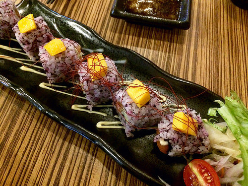壽司拌入紫蘇梅,中間包著挪威燻鮭魚,加上時令芒果