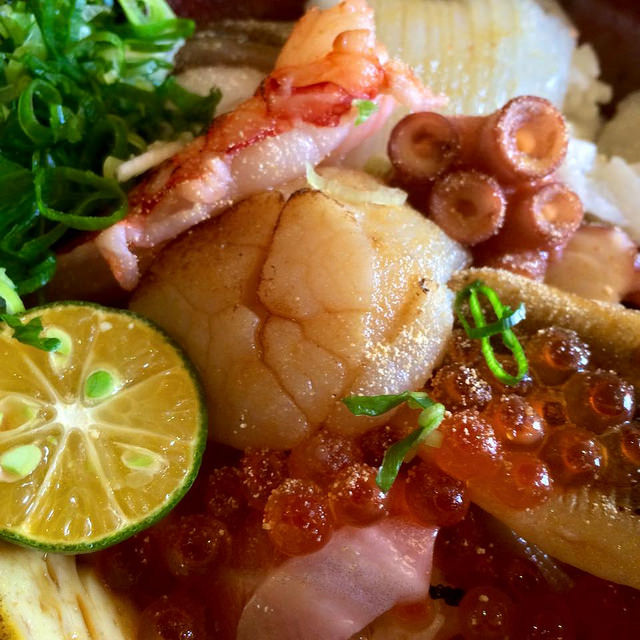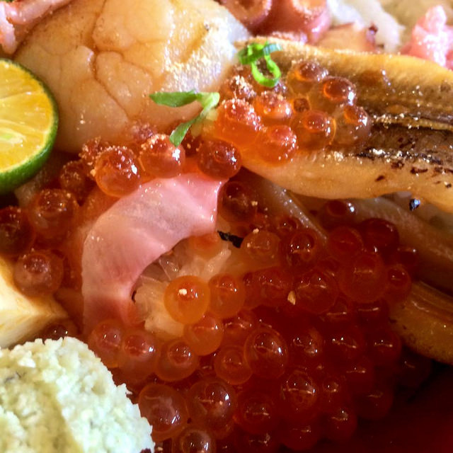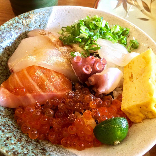 算是精簡版的綜合海鮮丼:鮭魚、章魚、鮪魚、鮭魚卵、軟絲、玉子燒
