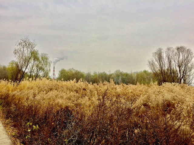 最後,一路走到了東邊的盡頭。眼前又是另一番景致,整片黃褐色的蘆葦叢,映著遠方冒著冉冉白煙的工廠,幾許蕭瑟。