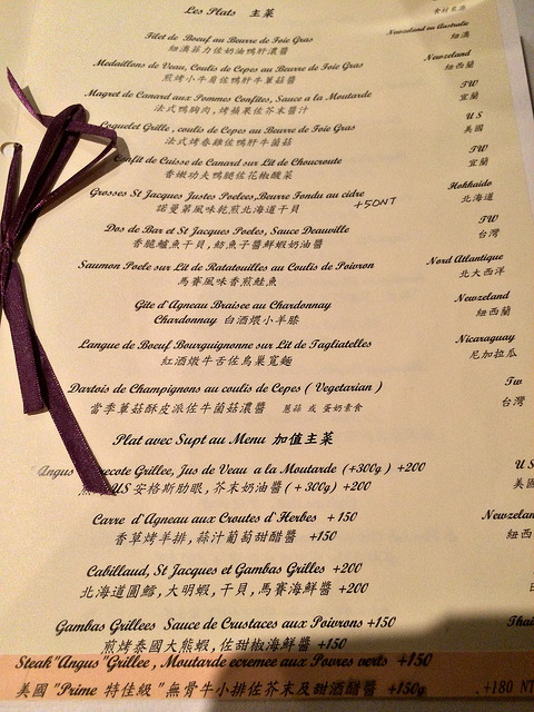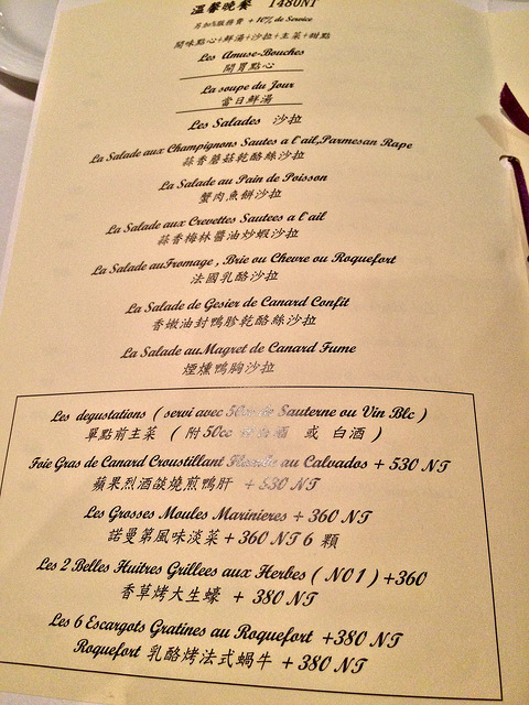 完整的法式套餐包含了前菜、沙拉、麵包、湯品、主菜與甜點。除了加價項目外,價格都一律NT$1480+10%,以正式法式料理的晚餐來講,這價錢真是出乎意料的親切!