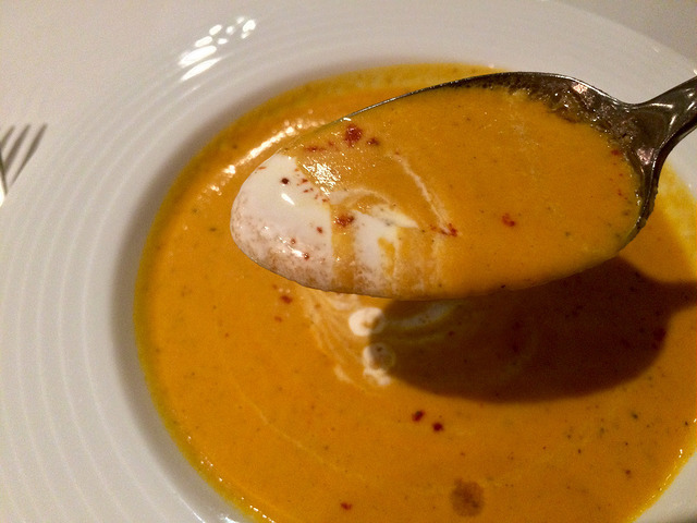 長得像南瓜湯,喝起來其實也挺像。明顯的肉桂香,非常濃稠、帶著甜味的口感,還吃得到蔬菜的纖維