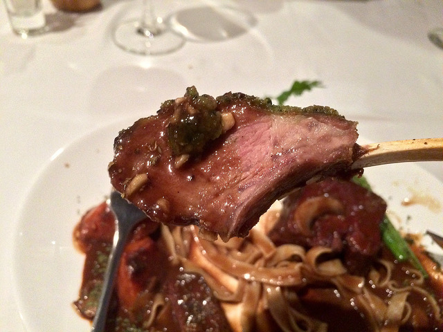 很久沒吃到好吃的羊排了。這兒的粉嫩的切面雖然看起來誘人,肉質卻太硬,也有點乾,醬汁反倒好吃,不是充滿牙膏味的薄荷醬,利用大蒜、甜酒與番茄熬煮,濃縮後再加入奶油與大蒜,精華都被淬煉出來了,好想用麵包把盤子清乾淨啊