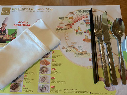 中間的圓形區主要是麵包、水果為主,其他則四散周圍。桌上餐墊紙還貼心的附了可愛的餐廳地圖插畫,讓人一目了然。當天客人不多卻不冷清,看得出這兒仍受許多商務客喜愛。