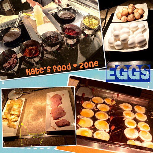 不能少的現場蛋料理。另外還有水煮蛋、茶葉蛋、蛋餅、蔥蛋、荷包蛋——蛋蛋大全!(?)歐姆蛋有蘑菇、番茄、橄欖、培根、起司等自選餡料。一個飽滿漂亮的形狀,湯匙切下所見是爆多的餡料與湯汁,好好吃!