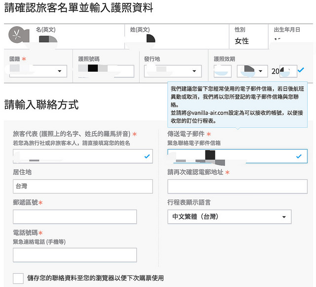 包括護照資料、旅客聯絡訊息。注意「電子信箱」要填可以確實收信的,以免收不到訂票郵件。